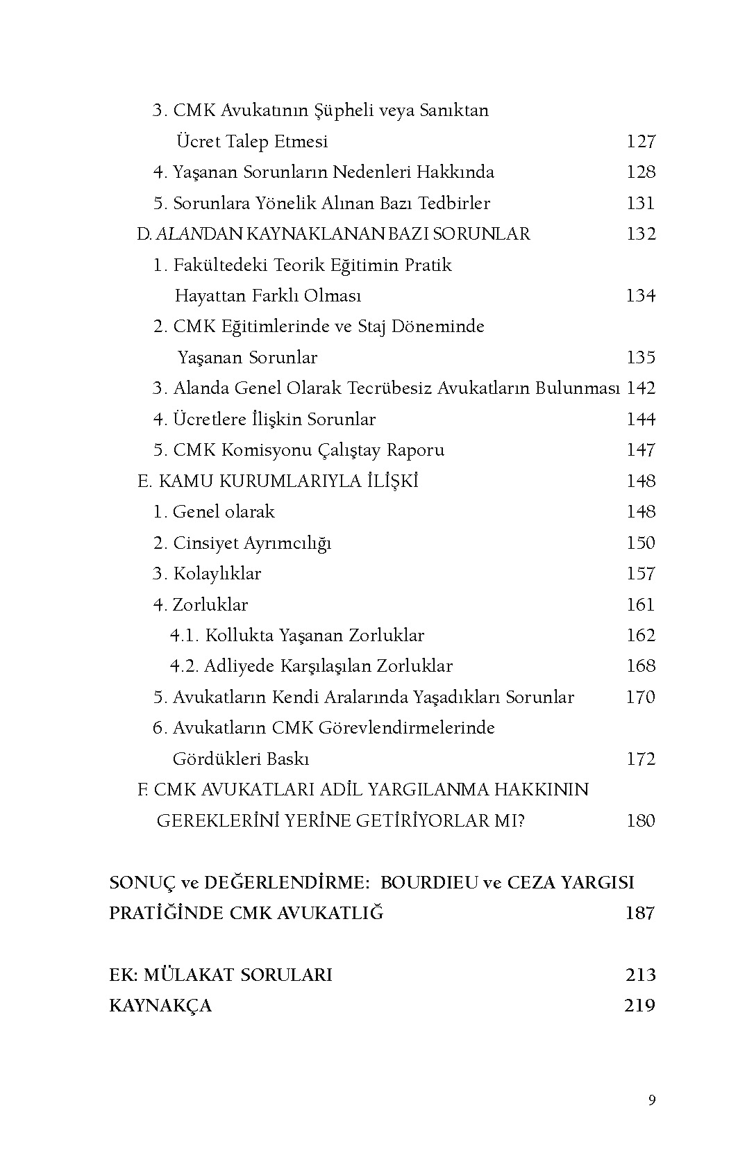 Bu kitap, hukuki bir kurum olan CMK avukatlığı ile bu kuruma dahil olan öznelerin kuruma ilişkin davranış, inanç ve algılarına odaklanıyor ve ilgili öznelerin CMK avukatlığı kurumundan nasıl etkilendiğini ve onu nasıl etkilediklerini anlamayı ve açıklamayı amaçlıyor. ‘CMK avukatlığı pratiğini belirleyen ve etkileyen temel etkenler nelerdir? CMK avukatı etkili ve yetkin olarak görülmüyorsa bunun pratikten kaynaklanan sebepleri nelerdir? CMK avukatına karşı bir önyargı var mı? Varsa, bu gerçekten bir önyargı mı?’ sorularının peşinden giden yazarlar, alan araştırmasından ve istatiksel verilerden elde ettikleri verilere dayanarak elde ettikleri bulguları Pierre Bourdieu’nün kavramlarıyla ilişkilendiriliyor.